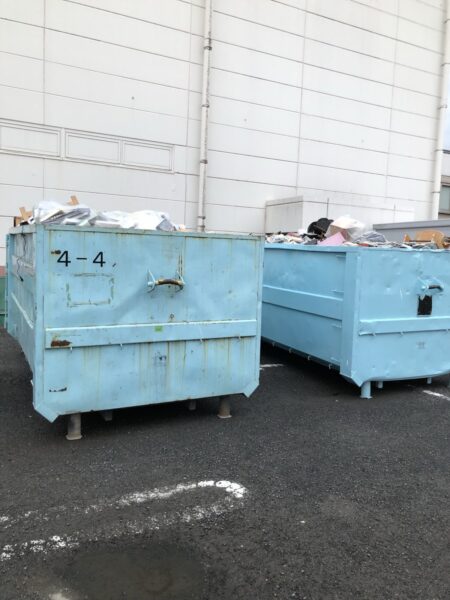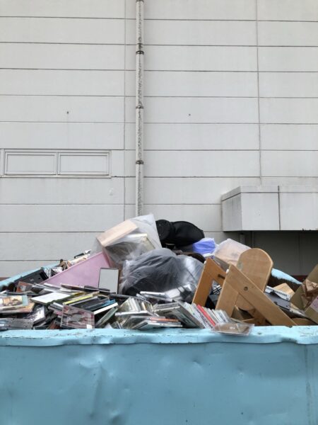 お店の外にはコンテナが。私が見ていると程なくして清掃業者のトラックが回収して行きました。残念ながら地震でダメになってしまった商品は廃棄されるようです。無念。私のようなスカベンジャーには宝の山にしか見えません。