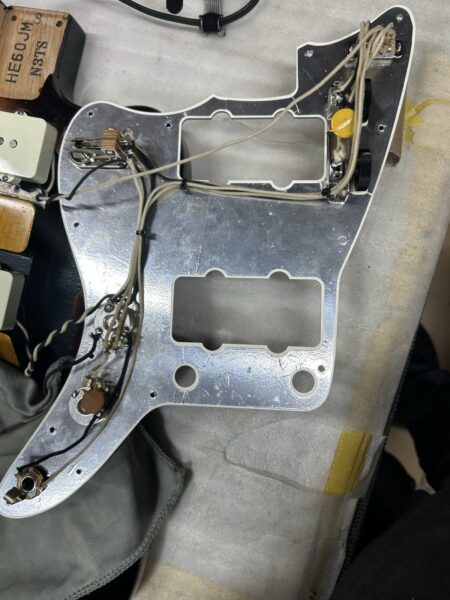 しかし目に見えない部分があまりに酷い状態でした。改造歴ありとの事なので中身を確認するべくピックガードをパカッと開けてみると、まあ配線のひどいこと。