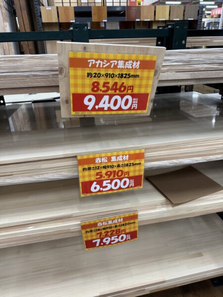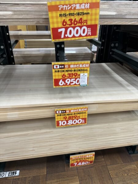 今回はMDF(Medium Density Fiberboard)やパーティクルボードのように木の繊維を固めた材を避けて、集成材を使います。集成材というのは小さい木材を継いで一枚の板に仕上げているものですね。丈夫で安く、見栄えもよいのでDIYの定番です。