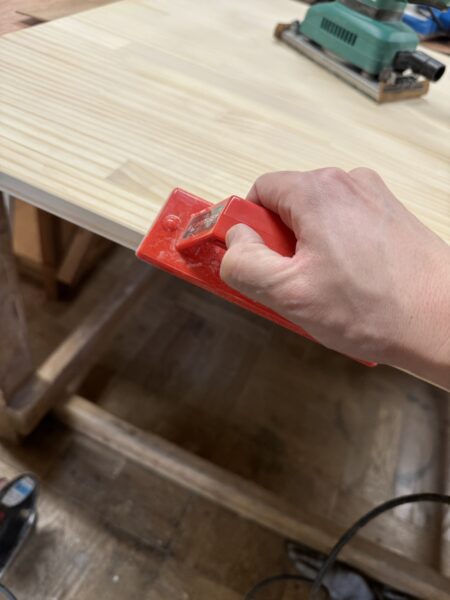 まずはオービタルサンダーで表面を整えます。400番くらいで仕上げました。この工程の仕上がりは最後まで影響しますので、省略は出来ません。手作業では日が暮れてしまいますから、電動工具は使いましょうね。ホームセンターで数百円でレンタル出来ます。