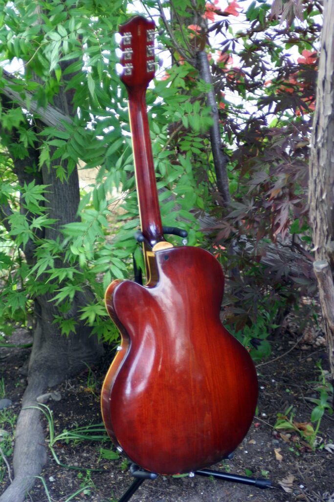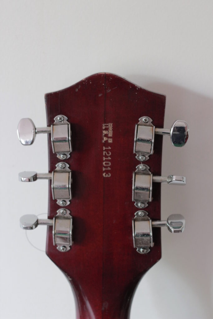 再び開口されたFホール、ピックガードの形状を変更してボディトップに直付け、妙に赤いボディ、野暮ったいヘッドストック、金属製のエスカッション、ボディ裏に移動したトラスロッドカバーなど・・・。一目見て分かる「ダメだこりゃ」状態で、明らかにデザインが混乱しています。程なくして倒産したのも納得です。
